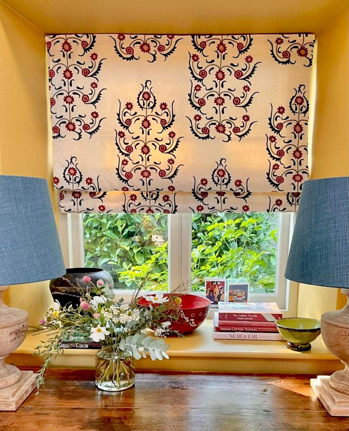 Beautifully made Roman blind with wooden baton covered in the design, ready for installation – wall fixings not included.